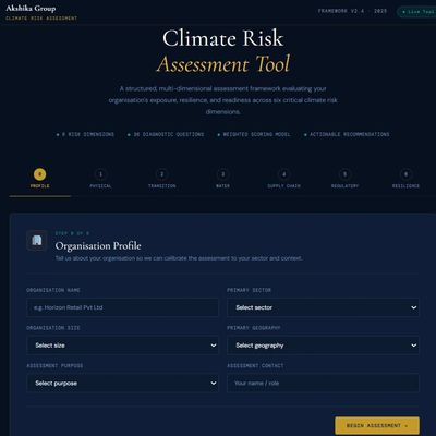 A 5-step interactive diagnostic built for banks, retailers, Manufacturers, NBFCs, Corporates, etc. to quantify climate exposure and get a prioritized action plan in under 10 minutes.